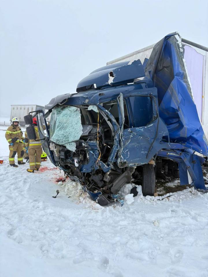 Wypadek z udziałem ciężarówek dwóch ciężarówek i dwóch osobówek. Ranni kierowcy, jedna osoba uwięziona w aucie [Foto]
